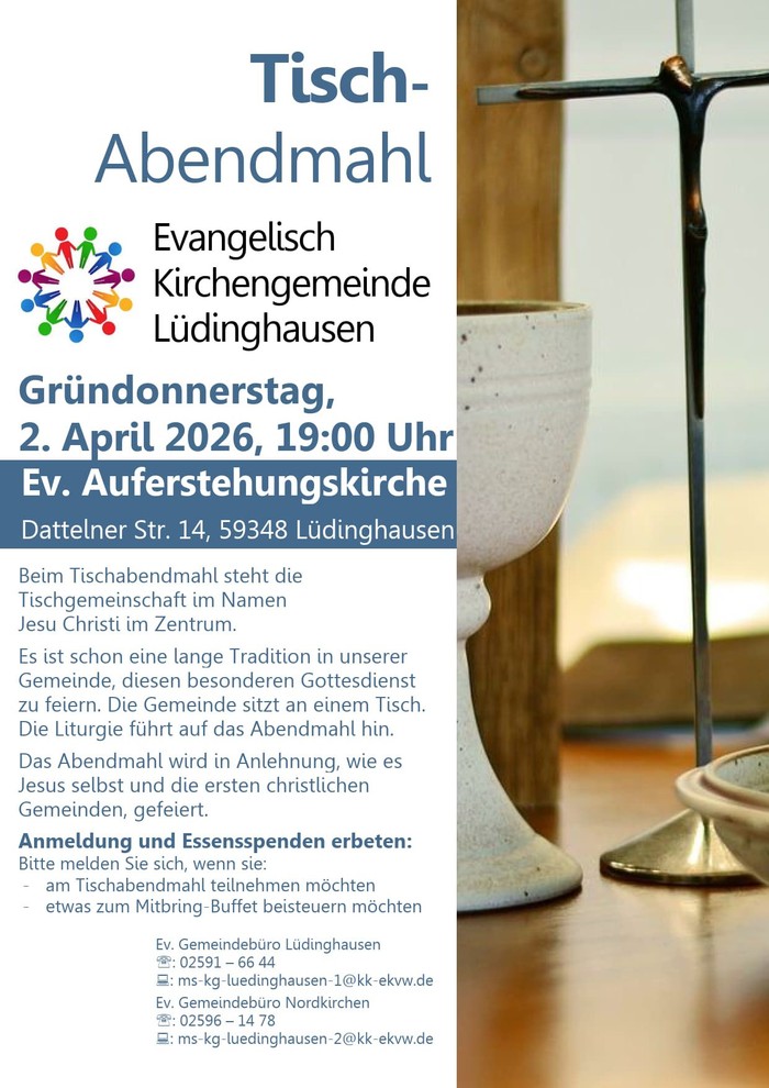 Am Gründonnerstag, 2. April 2026, um 19:00 Uhr lädt unsere Kirchengemeinde zum Tischabendmahl in die Auferstehungskirche in Seppenrade ein. In besonderer Atmosphäre feiern wir Abendmahl in Tischgemeinschaft – in Erinnerung an die ersten christlichen Gemeinden und im gemeinsamen Miteinander rund um einen Tisch. Wer teilnehmen oder etwas zum Mitbring-Buffet beitragen möchte, wird um Anmeldung im Gemeindebüro gebeten.